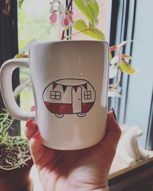 Rae Dunn USA White Cup Blue Inside with Camper Image on Back
