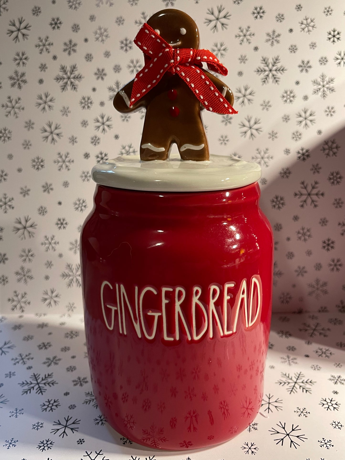Rae Dunn Gingerbread Red Canister with White Lettering and GingerBread Man Top Lid