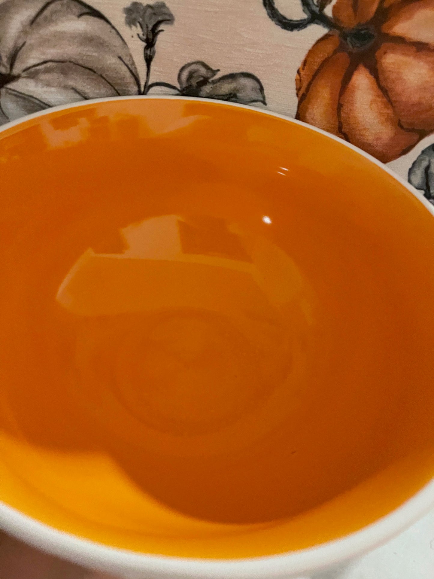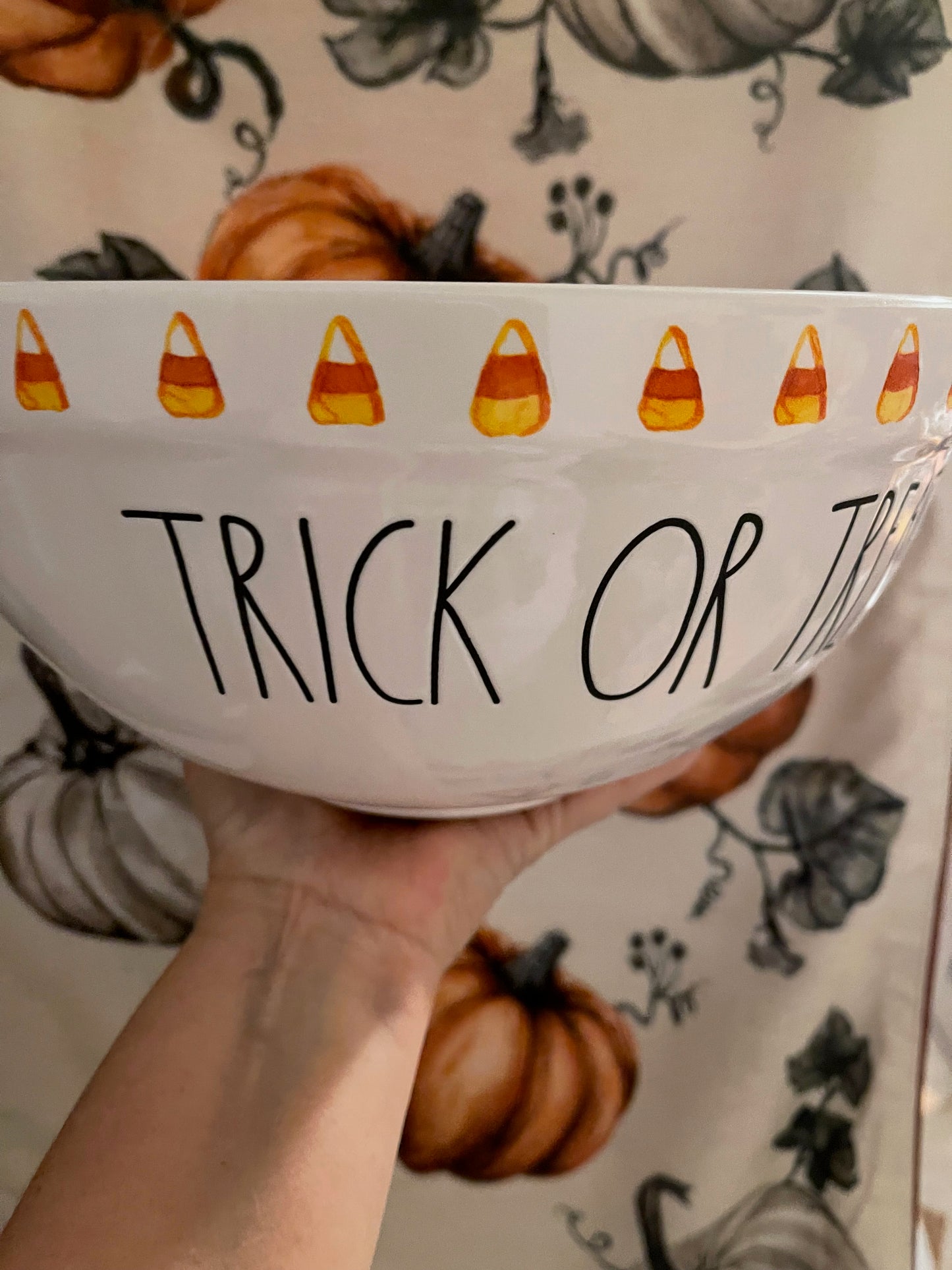 Rae Dunn Trick or Treat Large Candy Bowl with Candy Corns on Rim and Orange Inside